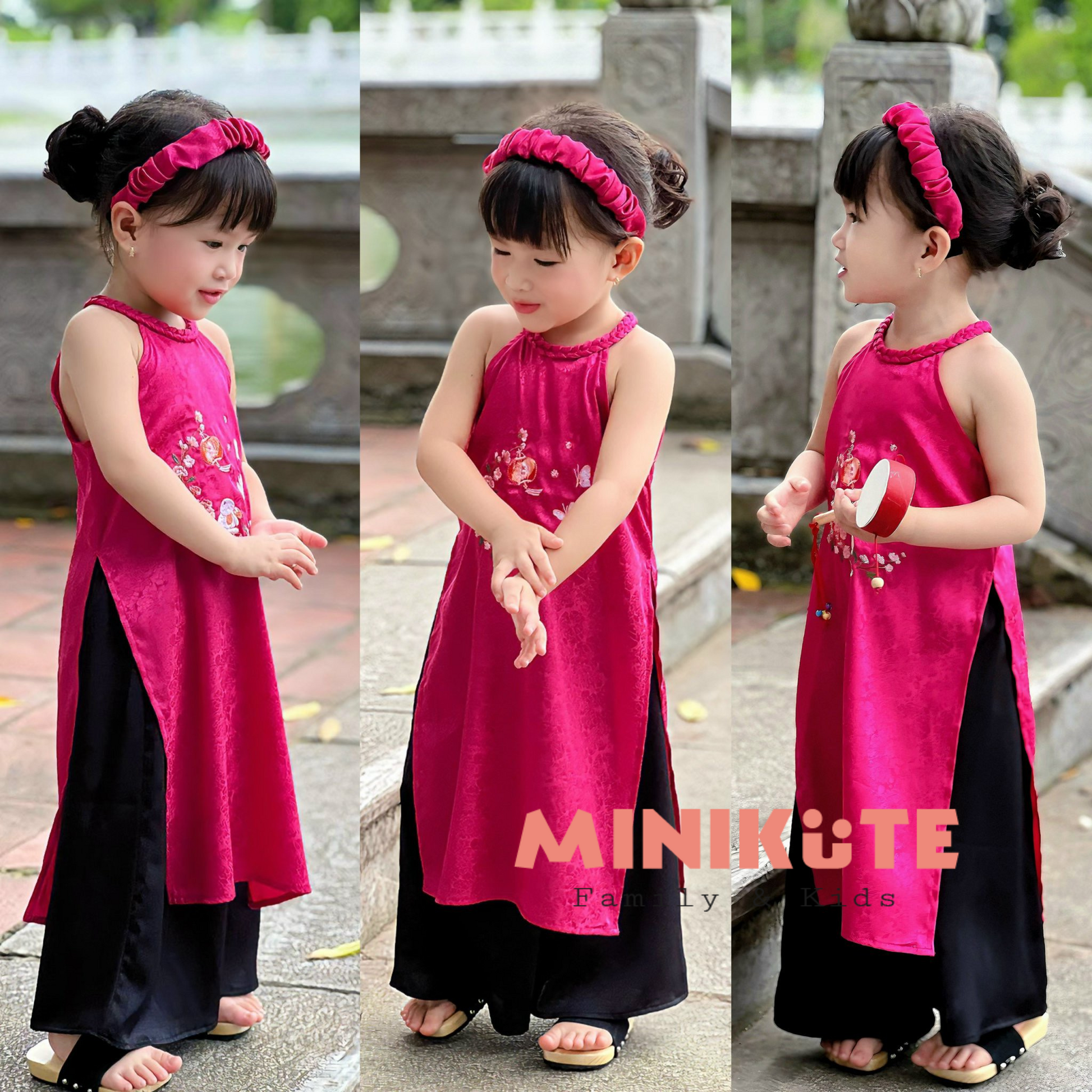 Set bao gồm áo dài với phần cổ yếm duyên dáng, kết hợp cùng quần lụa ống rộng nhẹ nhàng, tạo cảm giác thoải mái và thanh thoát khi di chuyển. Băng đô đi kèm làm điểm nhấn tinh tế, giúp hoàn thiện bộ trang phục và tôn lên vẻ nữ tính, dịu dàng.